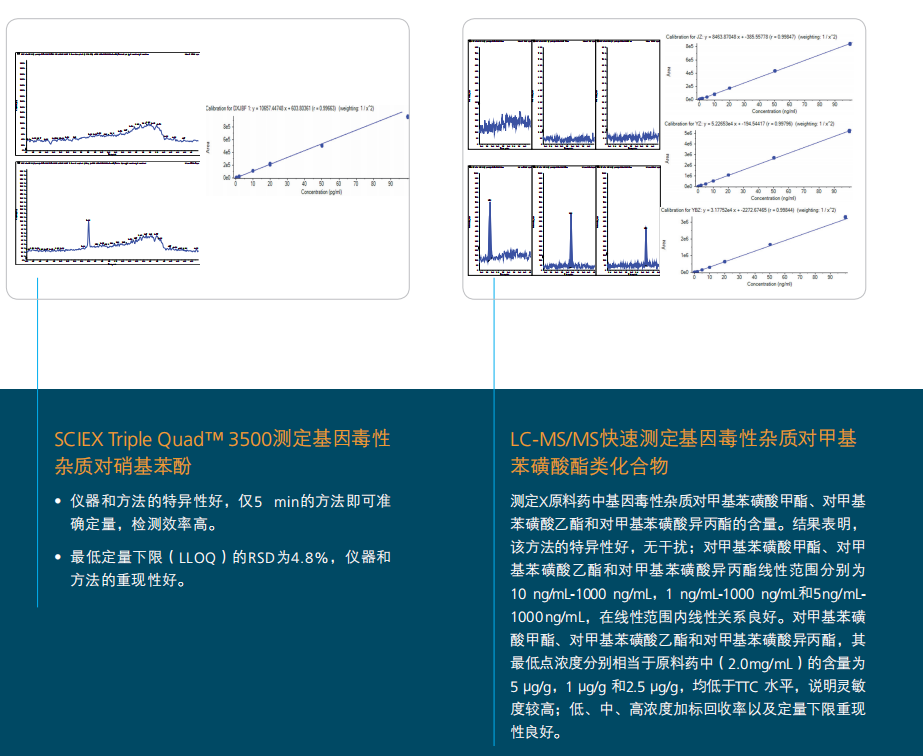 包括基因毒性雜質在內的藥物雜質 研究是近年來研究的熱點。藥物合成、配置或者儲藏過程中會形成中 間產物,這些藥物副產物可能會與. DNA反應,導致藥物的副作用,所 以,必須要進行監測藥物雜質。 按照FDA和EMEA指南,必須對原料 藥或藥品中任何可能存在、未在早 期合,成步驟中清除的所有基因毒性 雜質進行監測,其限度則需控制到 μg/g級別,所以,選擇LC-MSMS技 術進行更為深入的基因毒性雜質定 量分析是zui佳選擇。